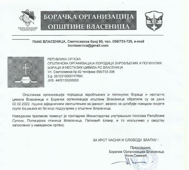 Na portalu Vlasenica24.info objavljeno je novo saopštenje Boračke organizacije u kojem se amnestira uloga policajca Elvira Patkovića u cijelom slučaju.
