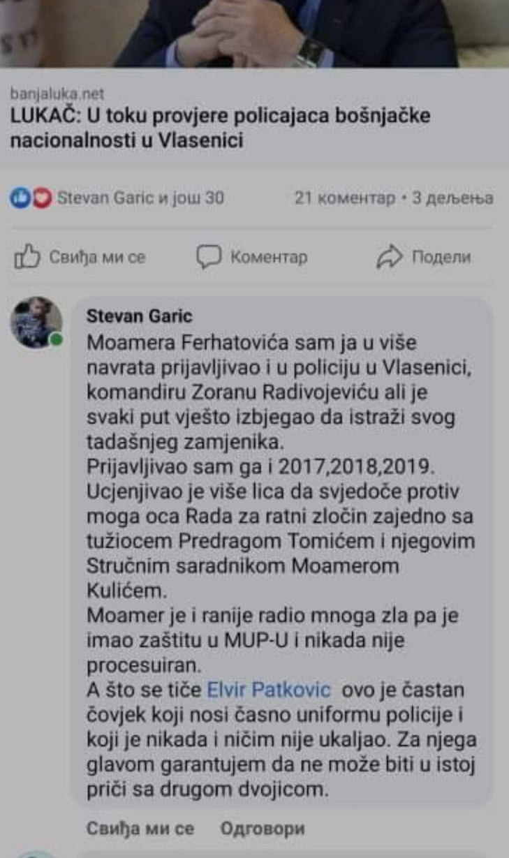 Nije jednom nego više puta, policajac Patković je branjen na društvenim mrežama od velikosrpskih patriota, a njegov glavni “branitelj” je Stevan Garić sin presuđenog ratnog zločinca. Bošnjaci u Podrinju dobro znaju koga cijene lokalni Srbi i šta se sve treba uraditi da se stekne njihovo “poštovanje”. A kada vas cijeni i sin ratnog zločinca koji je i sam radikal i spreman da ponovo isto što i njegov stari, e onda možete misliti koliko ste te i takve zadužili.